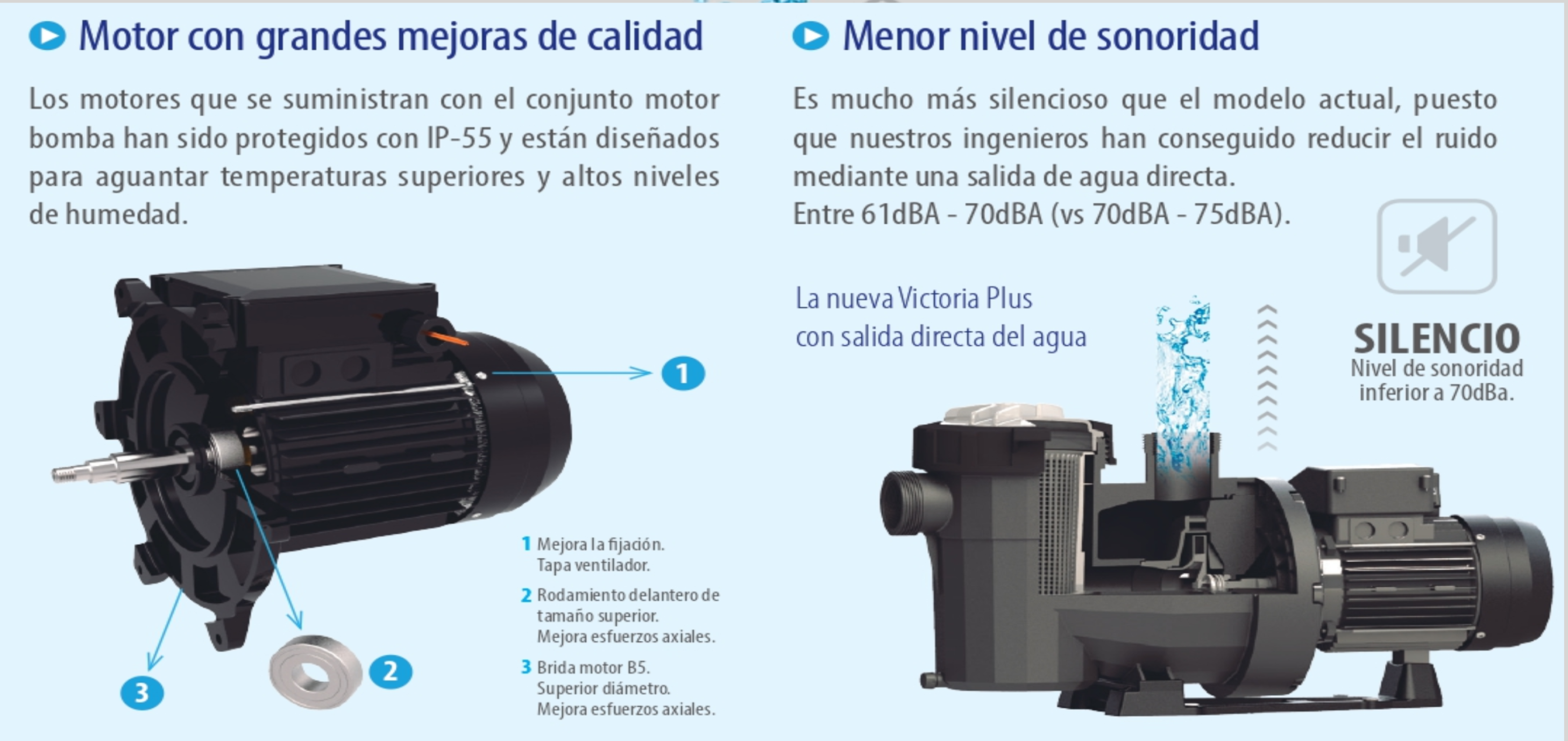 Las Victoria Plus Silent son la nueva generación de bombas de filtración, con potencias que van desde 1/2 CV hasta 3 CV y con motores monofásicos y trifásicos.